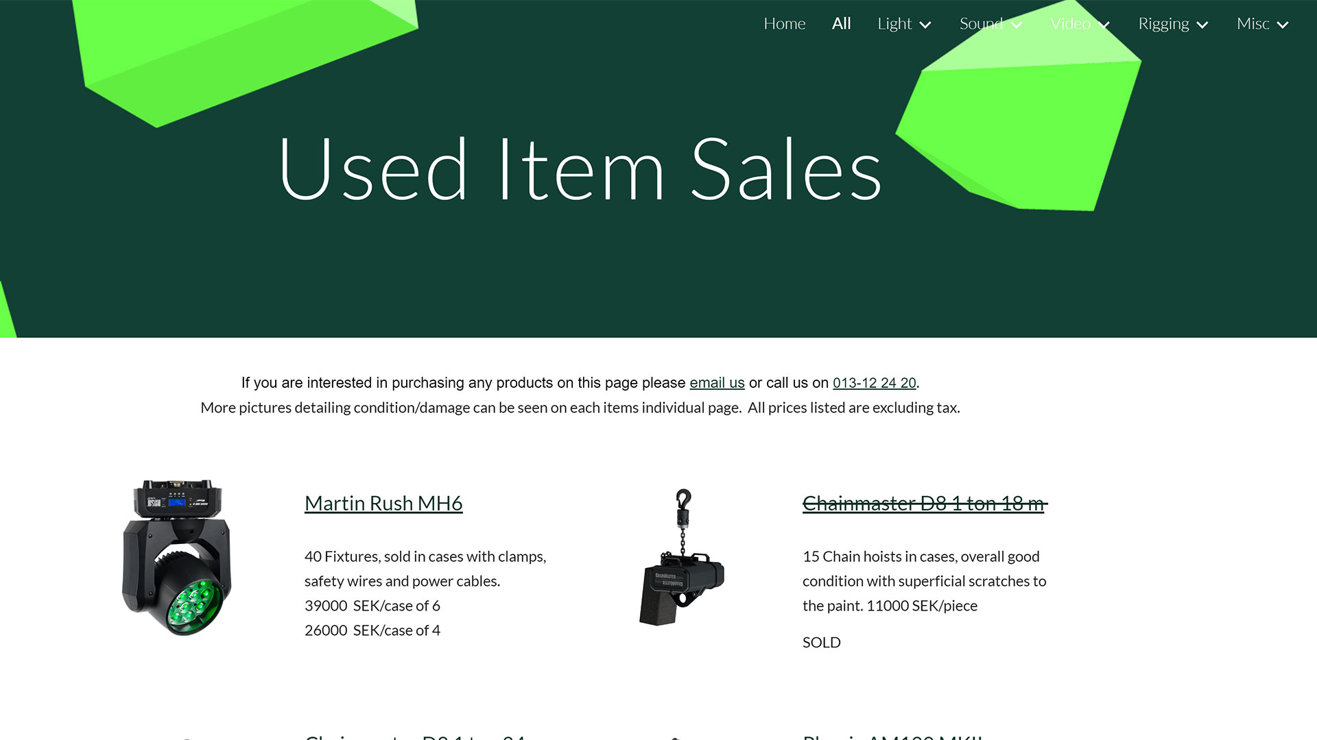 Our used equipment inventory includes audio, lighting, and video equipment, featuring items such as beMatrix LEDskin LED screens, lighting effects, cold fog machines, and other compelling products.