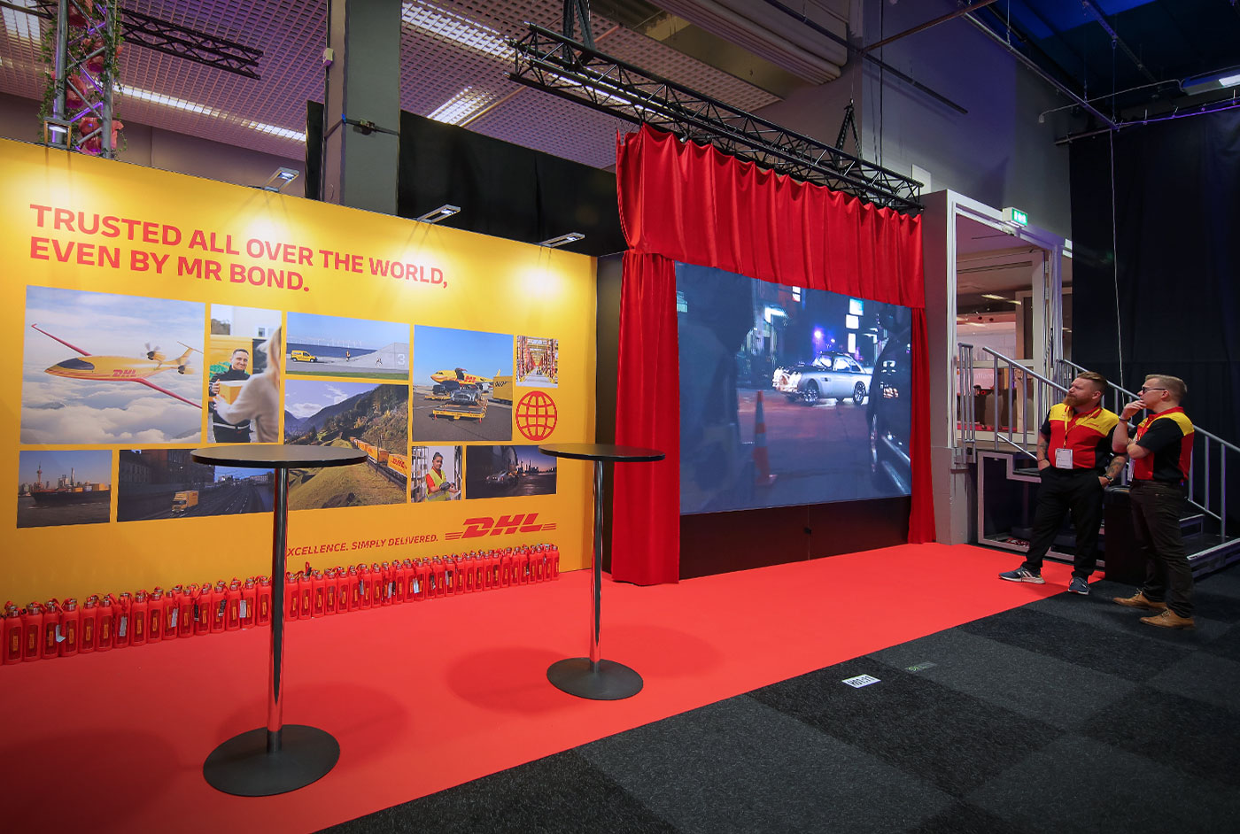 Budskapet DHL ville förmedla var att deras leveranser var både snabba och smidiga. För att gestalta detta på ett enkelt och tillgängligt sätt hade de spelat in en reklamfilm om projektet. Med hjälp av en stor bildskärm i montern kunde de spela upp filmen och visa besökarna hur de jobbade. För att sedan knyta ihop konceptet med James Bond-filmen skapade vi helt enkelt en liten biosalong.